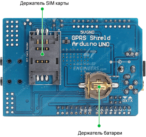 На нижней стороне платы находится гнездо для SIM карты. Любая активированная полноразмерная 2G SIM карта будет работать отлично.