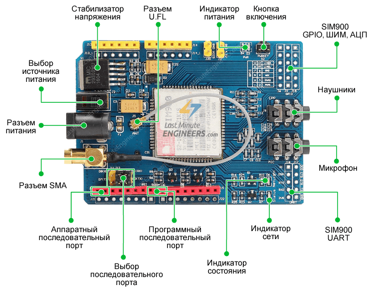 Плата расширения SIM900 GSM/GPRS Shield разработана для того, чтобы снабдить чип SIM900 всем необходимым для взаимодействия с Arduino, а также несколькими дополнительными вкусностями, чтобы воспользоваться уникальными функциями чипа.