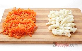 Мелко нарезать лук, морковь натереть на крупной терке.