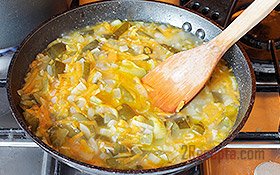 На растительном масле обжарить лук до золотистого цвета. Добавить морковь и немного обжарить все вместе.