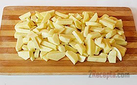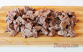 Отваренное мясо срезать с кости и нарезать на небольшие кусочки.