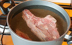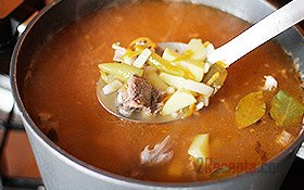 Мясо с перловкой отправить обратно в бульон и варить еще 30 минут.