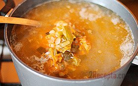 Туда же следом влить огуречный рассол, бросить лавровый лист и поперчить. По необходимости еще немного посолить, варить еще 10-15 минут до готовности.