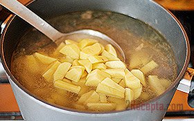 Когда мясо и перловка проварятся - в бульон добавить картофель, варить 15 минут.