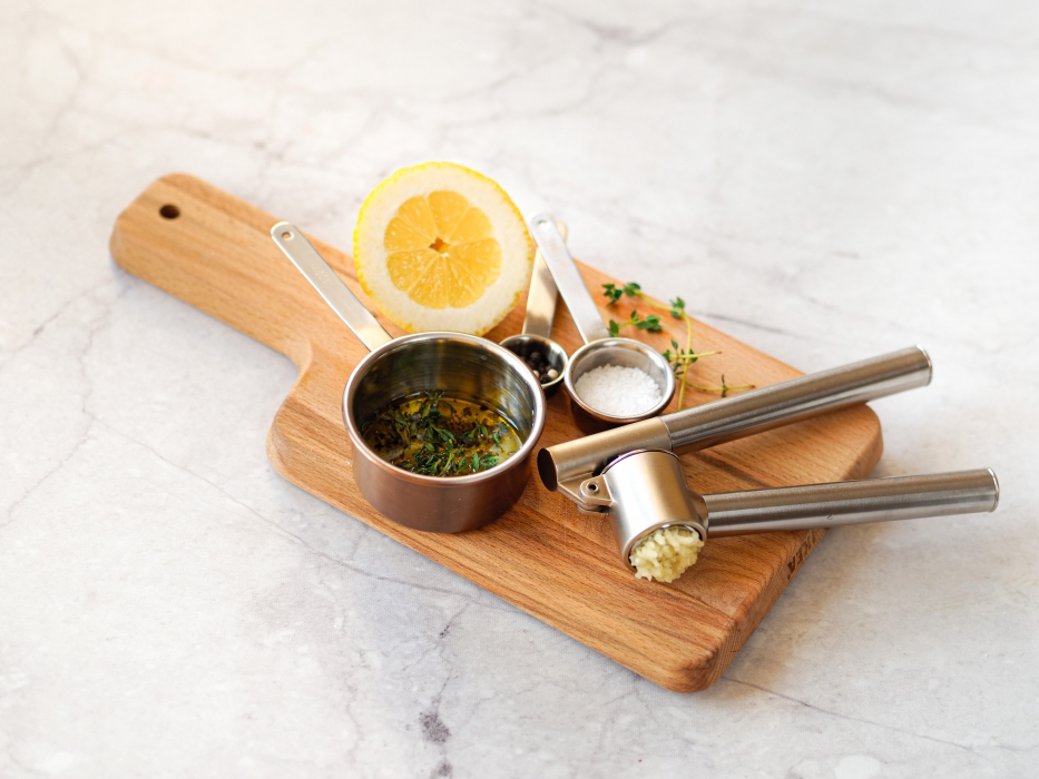 Для маринада смешать в небольшой миске 1 чайную ложку сока лимона, 1 столовую ложку оливкового масла, выдавить 1 зубчик чеснока, покрошить очень мелко пару веточек тимьяна. У розмарина убрать стебель и покрошить нежные листики. Добавить 2-3 щепотки соли и немного перца, исходя из ваших вкусов. Перемешать маринад до растворения крупинок соли.