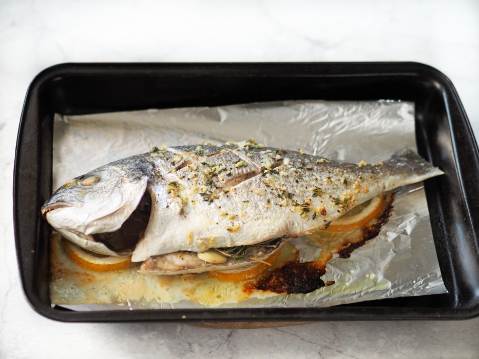 Выпекать 15-17 минут в разогретой до 180 градусов духовке. Время выпекания зависит от размера рыбы, более крупная дорада потребует чуть больше времени. Главное не пересушить ее, филе рыбы невероятно нежное. А лишние минуты в духовке могут пагубно повлиять на вкус. Если рыба выпустила сок, и надрезы полностью запеклись, значит она готова.